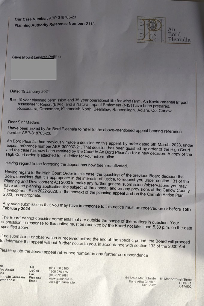 Many people who made submissions to An Bord Pleanála will have received a letter from An Bord Pleanála saying that further submissions can be accepted by 15th February 2024 by 5.30pm. Along with the letter was a 3-page document from the High Court noting that the ABP refusal had been quashed, and ‘that the appeal has now been reactivated’.