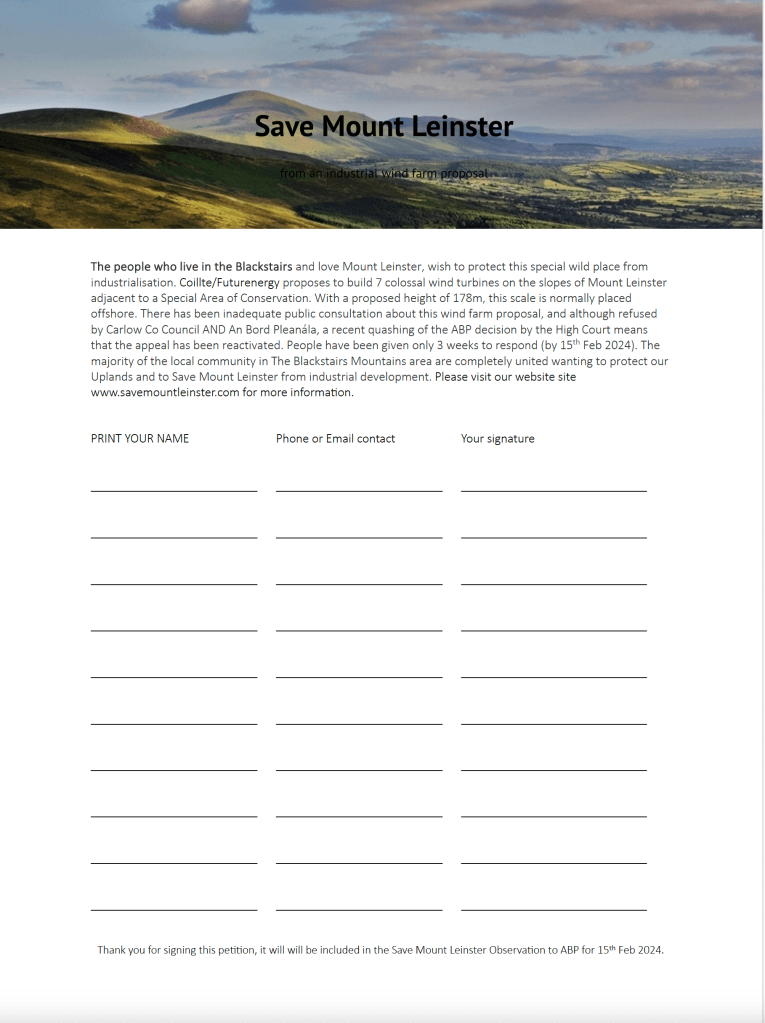 Thank you all for your support and here is an update on the latest development in this ongoing campaign, which began in 2020. Carlow County Council, in March 2021,and subsequently An Bord Pleanála (ABP),in March 2023, both refused planning permission for the proposed Coillte/Futurenergy wind farm on Croaghaun, part of the Blackstairs Mountains. 300 individual submissions were sent to Carlow Co Co and 150 unique observations to ABP, from mostly local people. An Uplift petition (run during Covid when physical petitions could not be circulated and signed) collected over 2,700 online signatures in 2021, and is now at 3,216 signatures (Jan 2024).