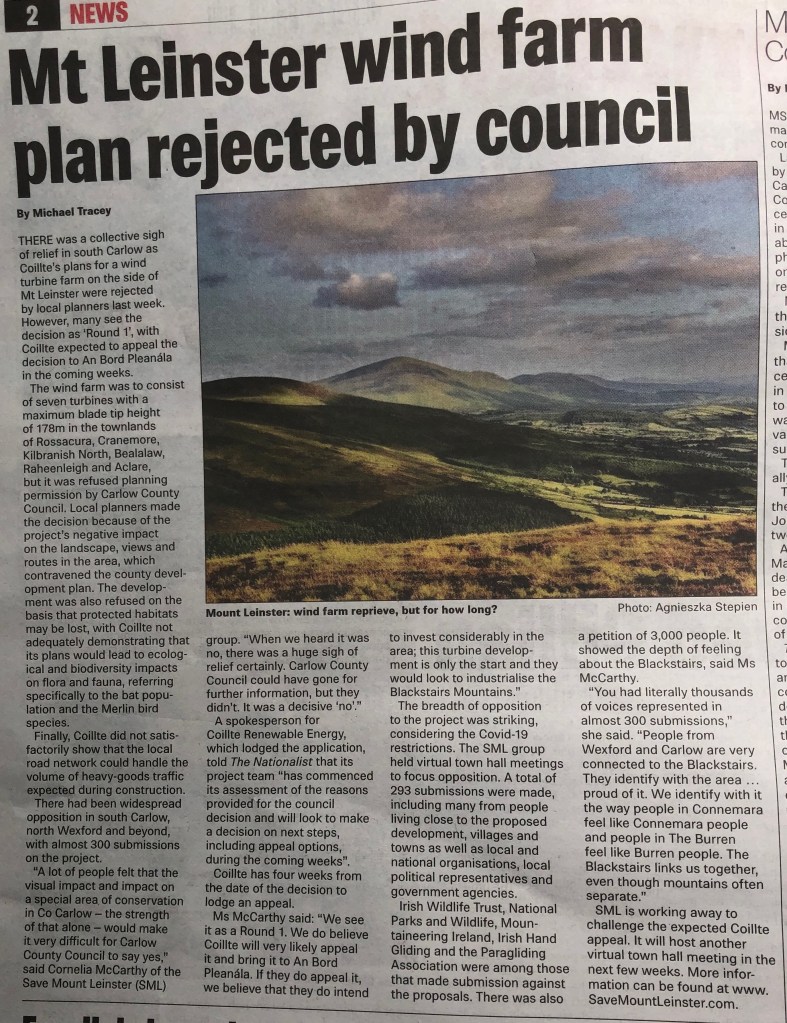 Round 2 is 4 weeks from 18th March 2021. Coillte CGA can and more than likely will challenge the refusal decision to An Bord Pleanála (ABP). It is essential that the Save Mount Leinster campaign, local communities, and individuals once again work together to meet this challenge if they wish to stop Coillte from opening up the Blackstairs mountains to industrial wind farms. SML believe that if Coillte appeal this decision, that they intend to invest considerably in the area and that this 7 turbine development in only the start.