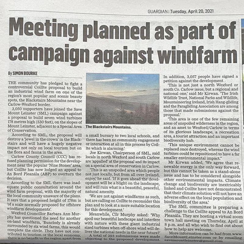 We hosted another virtual town hall meeting to update people about this new ‘round’ and also to advise and encourage individual observations to An Bord Pleanála. If you prefer, to assist the ‘Save Mount Leinster’ submission with your time, expertise or other resources to donate to the campaign, we would really appreciate it so please get in touch.