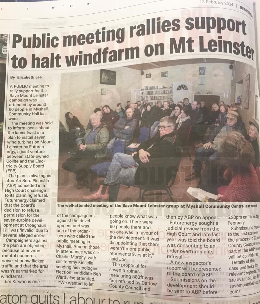 Over 80 people attended a well-run, informative and fully interactive ‘Virtual Town Hall’ meeting on Thursday 4th February from 7.30-9 pm in our Zoom Hall. Our community discussed the current windfarm proposal by Coillte at Corraby Gap/ Kilbrannish at Mount Leinster. Individuals and groups who are making an objection to this windfarm proposal discussed points to consider in their submission. Due to demand a similar second town hall meeting took place with over 60 people on Tuesday 9th Feb. Attendees included farmers, local residents , paragliders & hang gliders, walkers, mountain bikers, B&B owners and artists, Councillors, tourism providers and businesses in the area.